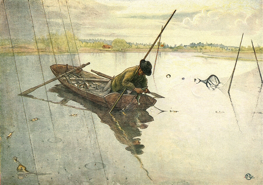 Carl Larsson skriver: ”Det är obeskrifligt otäckt att i kalla, regndisiga vårmornar klifva upp vid femtiden – hvar dag! – ur sin goda säng för att ro öfver till Bullerholmsviken och vittja näten. Vattnet är isigt och